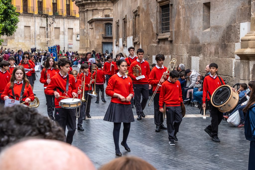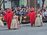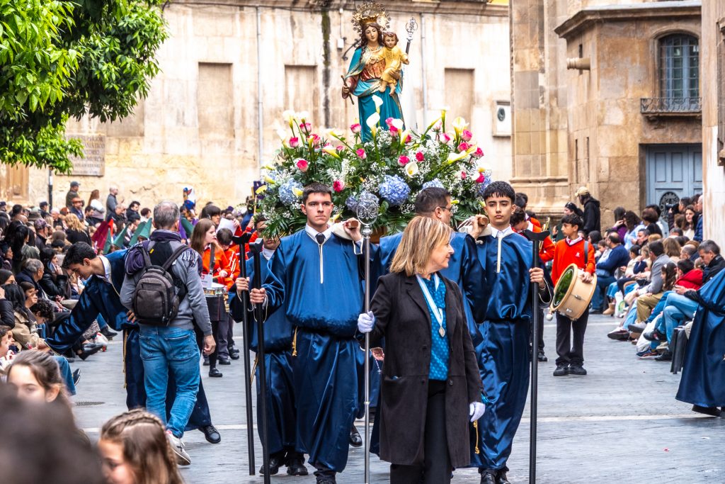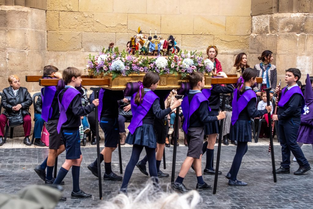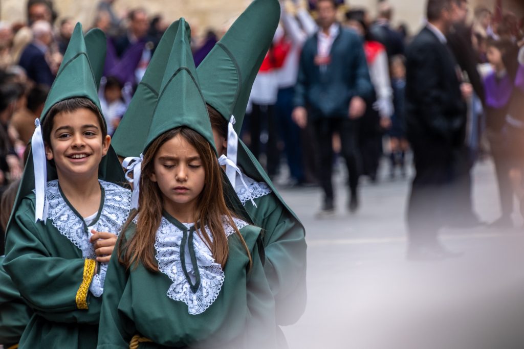 Als ich zur Kathedrale einbiege sehe ich es schon – es ist ein Umzug von Kindern und Jugendlichen, manche gekleidet in lange Büßergewänder verschiedener Farben und dazu spitze Hüte. Manche der Gruppen tragen Schreine mit sich.
