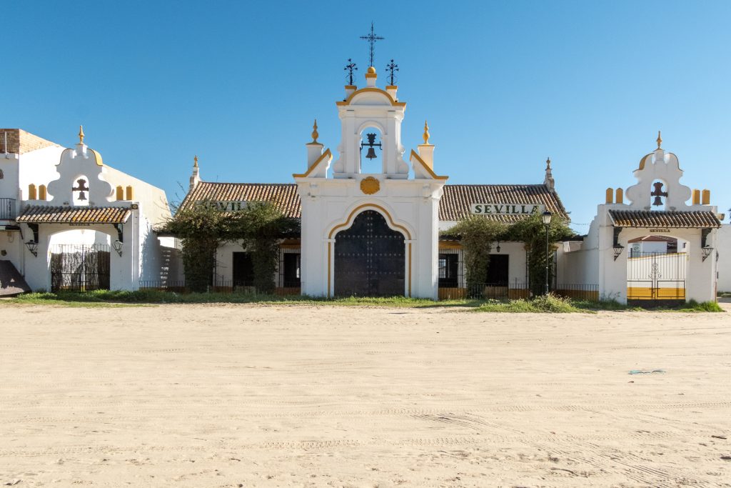 Heute fahre ich mit dem Fahrrad zunächst in das etwa 20 km entfernte Dorf El Rocio, bei uns eher unbekannt, ist El Rocio der zweitgrößte Wallfahrtsort Spaniens. Jedes Jahr an Pfingsten kommen etwa eine Million Besucher zur Verehrung der heiligen Jungfrau von Rocio in der gleichnamigen Wallfahrtskirche. Dann treffen die Pilgergruppen zu Fuß, zu Pferde oder mit der Kutsche im Dorf ein, eine Mischung aus tiefem Glauben und andalusischer Kultur mit Trachten und Flamenco. Da trifft es sich gut, dass es im Dorf keine asphaltierten Straßen gibt, alle Wege sind sandbedeckt, auch wenn außerhalb der Feierlichkeiten alle mit ihren PKWs hier Staub aufwirbeln.