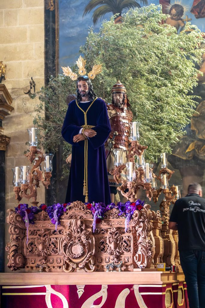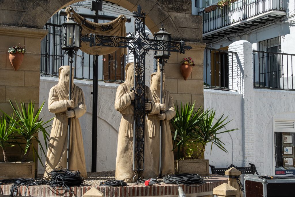 Die heutige Fahrt führt mich zu einem Campingplatz am Rande des Nationalparks von Doñana in der Provinz Huelva. Auf dem Weg dorthin mache ich nochmal Zwischenstation in einem weiteren weißen Dorf – Arcos de la Frontera. Das Dorf zieht sich wieder den Berg empor, oben thronen dann die maurische Festungsanlage und die katholische Kirche Santa María de la Asunción. Dort wird bereits alles geschmückt für die Seman Santa – die heilige Woche, von Palmsonntag bis Ostersonntag. Wie in vielen Gemeinden werden auch hier in Arcos in dieser Woche mehrere Prozessionen durch das Dorf ziehen. Im vorderen Bereich der Kirche wird gerade der Paso, der prächtige Figuren-Thron hergerichtet, der dabei von mehreren Trägern durch das Dorf geschleppt wird.