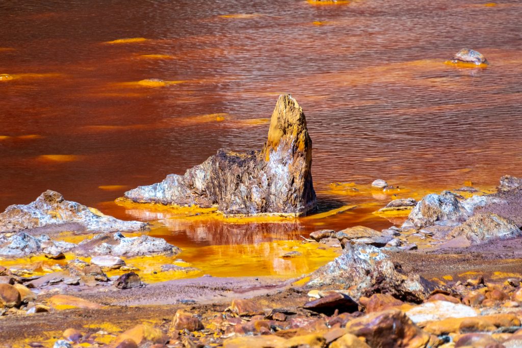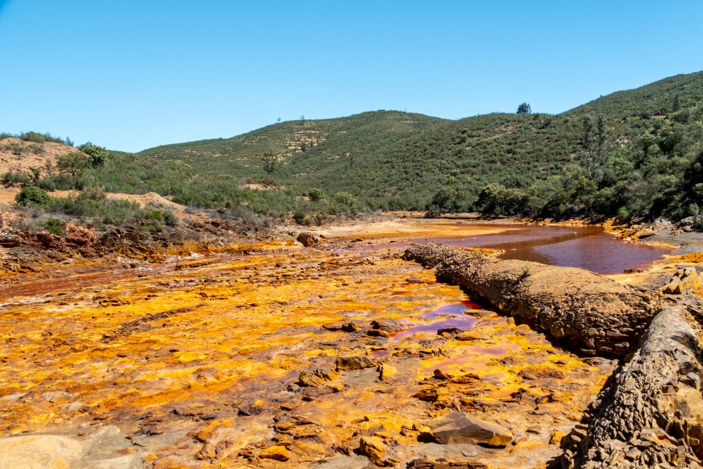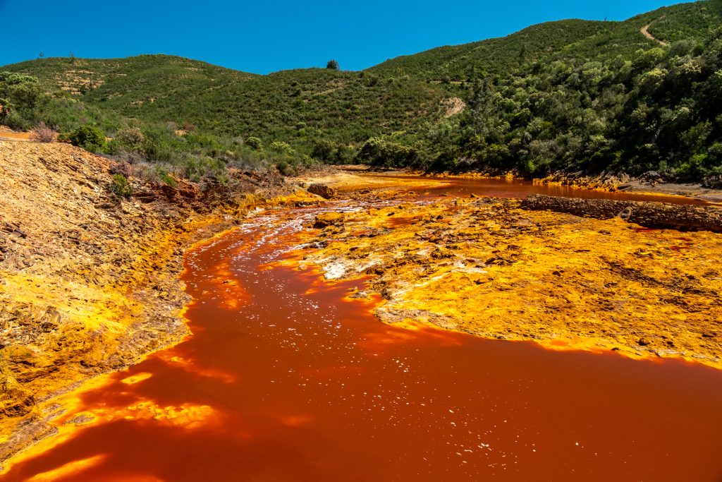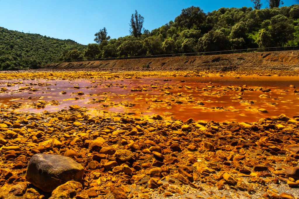 Ursache für die Verfärbung sind sulfidische Schwermetallminerale aus den Erzlagerstätten nahe seiner Quelle. Hier wird nachgewiesen seit über 5.000 Jahren Erz abgebaut und die Verwitterung der Abbauprodukte werden bei Regen in den Fluß gespült. Dieser ist aufgrund der Schwermetalle und der Schwefelsäure-Zuflüsse tot, außer einigen Bakterien kann kein Lebewesen im Fluß überleben.