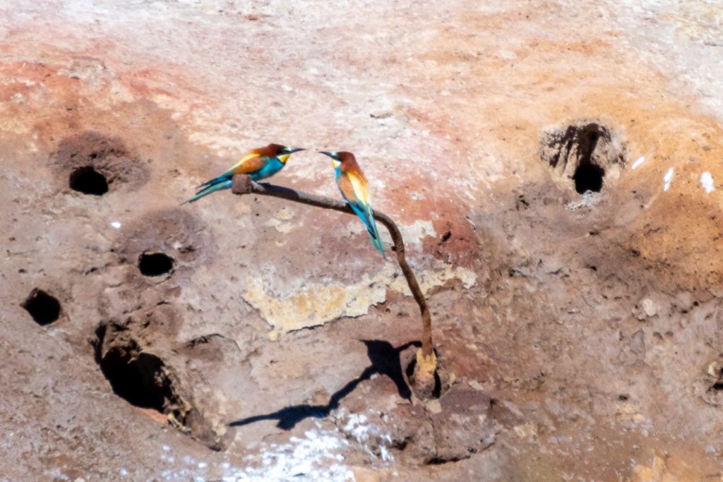 Auf der anderen Seite entdecke ich eine durchlöcherte Steilwand, welche von einer Kolonie Bienenfressern als Nistbereich genutzt wird. Zwei Falken, die hier kreisen, werden von ihnen gemeinsam vertrieben. Leider ist die Entfernung sehr groß, aber man kann die Vögel mit ihrem bunten Gefieder beim Einzoomen in die Fotos deutlich erkennen.