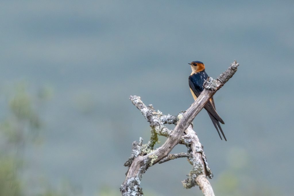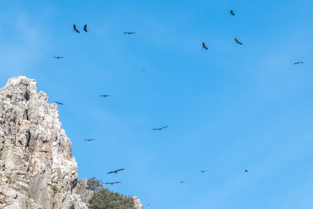 Unmittelbar neben meinem Standort erhebt sich ein kleinerer Fels, darauf zwei Geier. Sie sind so nah, dass etliche Portraitaufnahmen gelingen. Der Fels mit sicher mehr als 100 weiteren Tieren ist auf der anderen Seite des Tajos. Gegen Mittag sind immer mehr Tiere in der Luft und ziehen ihre Kreise. Ich habe unweit meines Standortes auf einem verdorrten Astnoch eine Rötelschwalbe entdeckt, von ihr noch ein, zwei Fotos, dann fahre ich eine kleine Straße flussaufwärts mit etlichen Aussichtspunkten durch den Park.