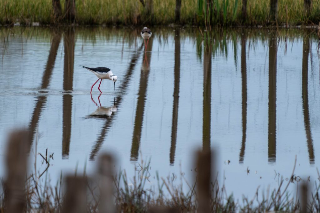 Es ist erst kurz nach 8, als ich mich zu dem etwa 5 km entfernten Naturschutzgebiet Méjean aufmache. An den Sportanlagen finde ich einen Parkplatz, der nicht mit einer Höhenbegrenzung ausgestattet ist und beginne die Wanderung zum und durch das Feuchtgebiet. Wald, Röhricht, Salzwiesen, Kanäle und Teiche bieten eine Heimat insbesondere für viele Arten von Vögeln. Verschiedenee Reiherarten, Watvögel und Flamingos sind hier neben Enten, Gänsen etc. zu beobachten. Außerdem befinden sich auf dem Gelände etliche Storchenneste. Manch Baum beherbergt gleich mehrere Nester – ein Mehrfamilienbaum sozusagen.