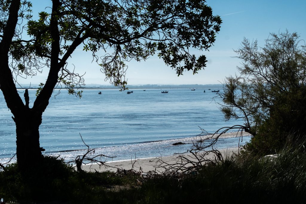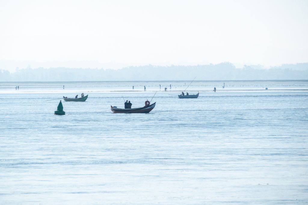 Aber zunächst fahre ich noch die Küste entlang. Auf der Lagune sind viele Fischerboote unterwegs. Hier wird wird geangelt, während andere im Niedrigwasser nach Muscheln suchen.