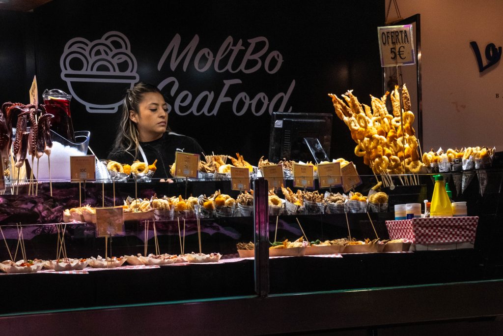Danach besuche ich den Hafen und zwei Markthallen. Am Hafen ist eine Wagenburg eines historischen Zirkus aufgebaut. Die alten Fahrzeuge und Zirkuswagen erinnern an Roncalli. Die zweite Markthalle nahe der Rambla ist inzwischen mehr Touristenspot als klassischer Markt. An den meisten Ständen bekommt man vorbereitete Tapas aus den Marktprodukten, aus Fleisch, Fisch und Obst. Alles schön hergerichtet und bunt, Einheimische kaufen hier aber vermutlich nicht mehr ein.